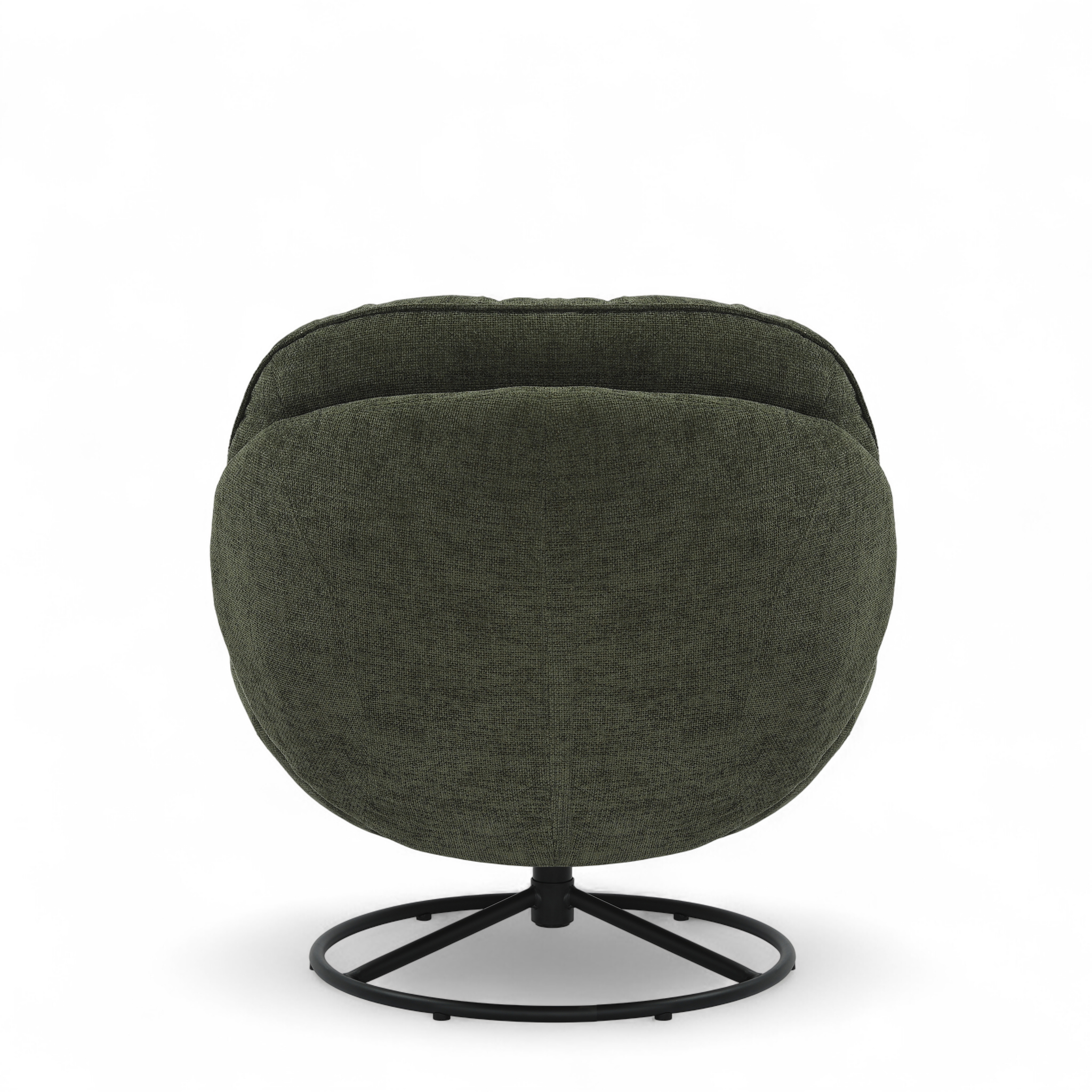 The Green Chenille Fabric Azura Swivel Accent Chair showcases a modern and inviting design. The design focuses on soft curves, with a rounded silhouette and overstuffed appearance. The rounded backrest and seat combine with the curved arm sections to create a sense of comfort and enclosure. It stands on a circular base, which further enhances the soft aesthetic, and offers swivel functionality to the chair. Prioritising comfort and convenience, it comes with a matching footstool. Elements of this design borrow from retro and industrial interiors, making this accent swivel chair a versatile addition to your home. The Azura Swivel Accent Chair is upholstered in beautiful deep green chenille fabric, making it the perfect choice to tie a colour scheme together. The deep buttoned backrest highlights the elegance of the chenille upholstery.