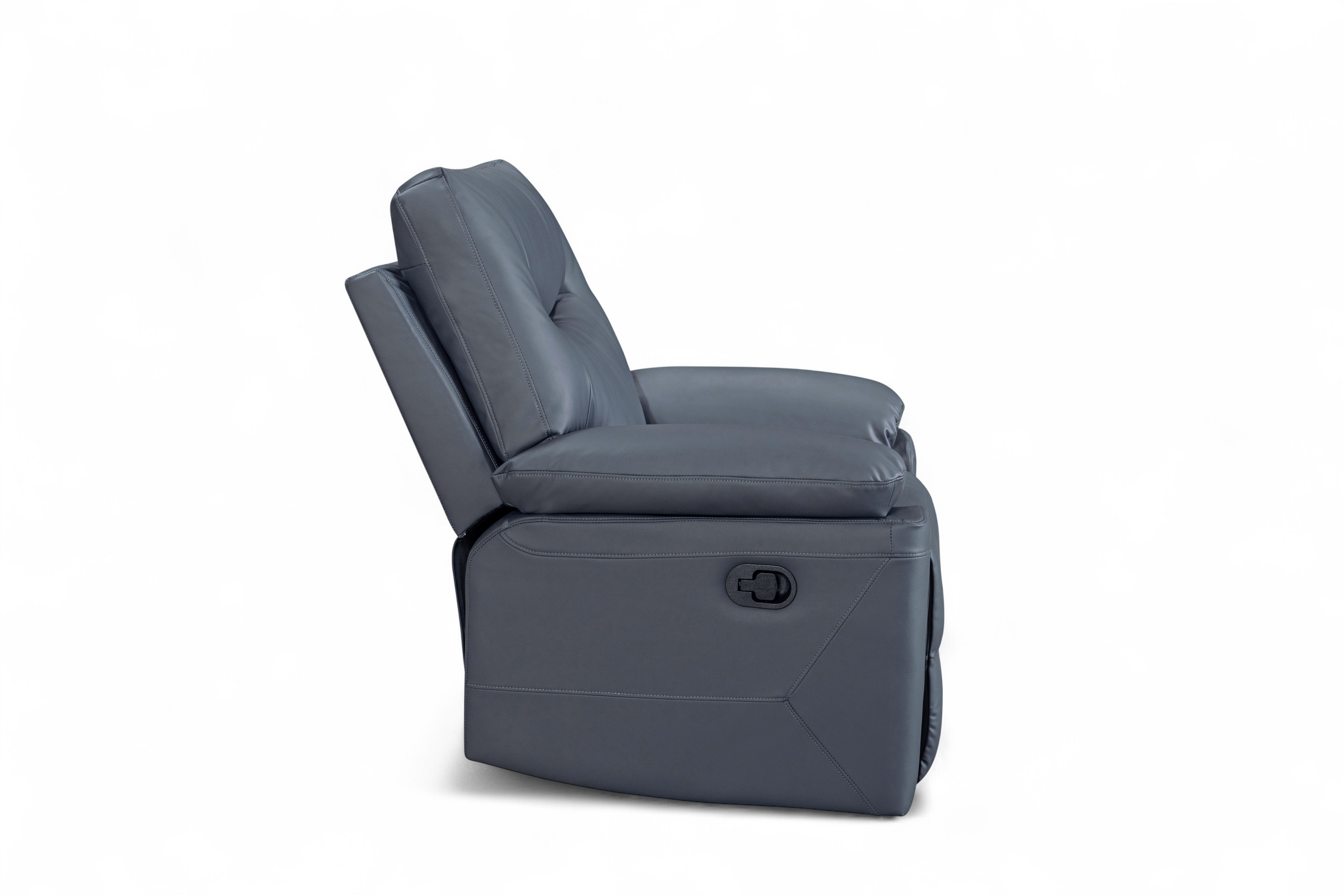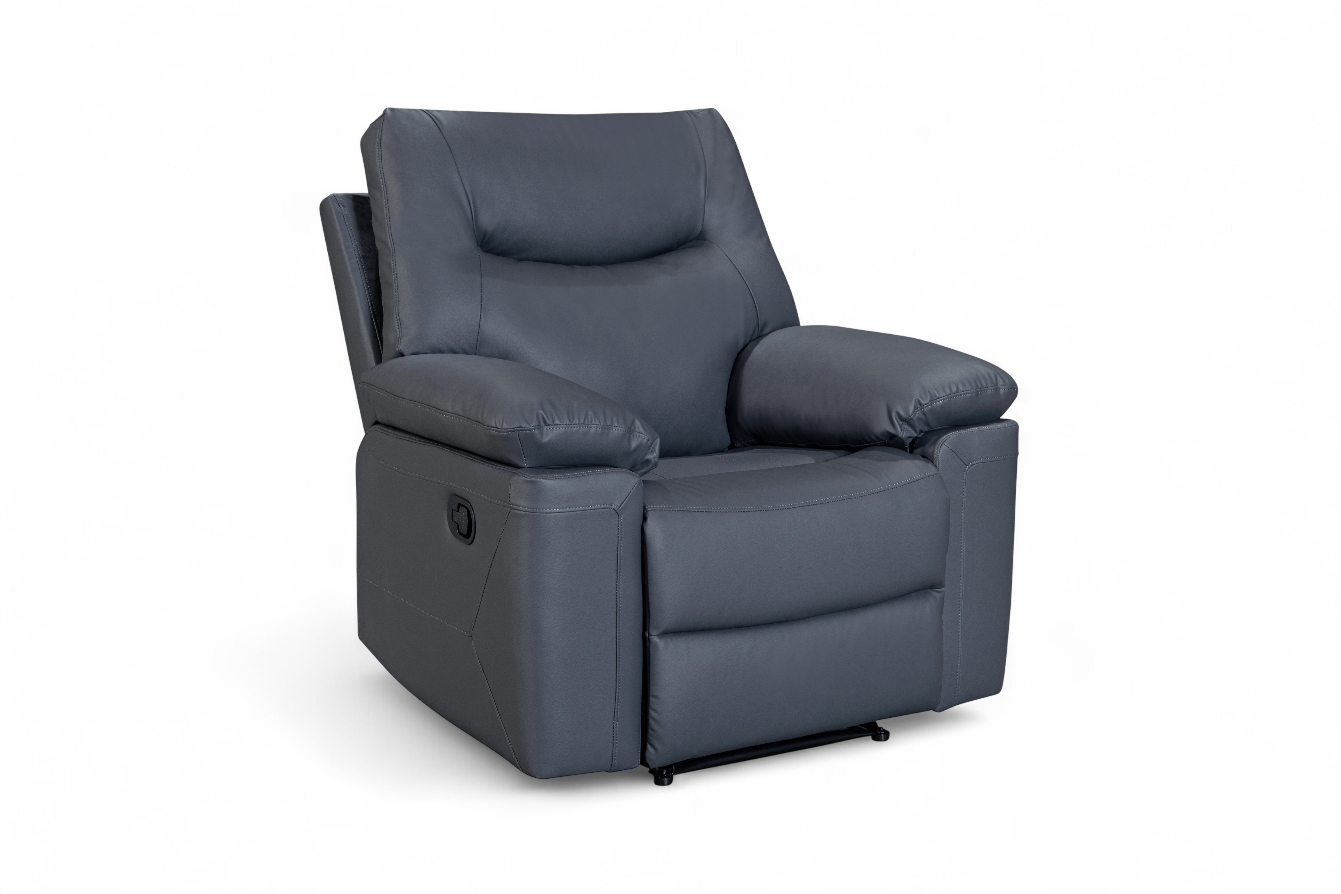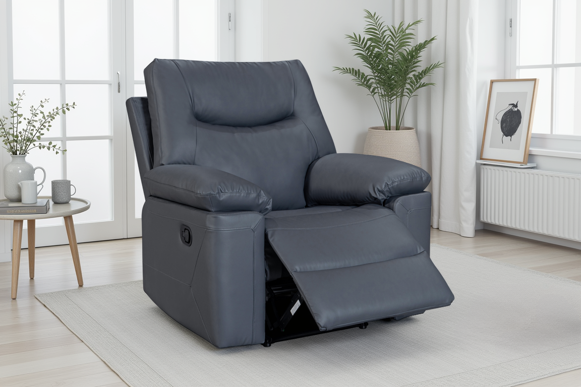 The Columbia Recliner Chair is upholstered in dark grey faux leather with a smooth, matte finish. The design is clean and modern, with gently curved lines and subtle stitching detail. It features a manual lever-operated recline function, allowing you to lean back and put your feet up to unwind. The padding is generously filled for everyday comfort, with soft armrests and plush back cushions designed to support. A practical choice for smaller rooms or paired with other pieces from this range.