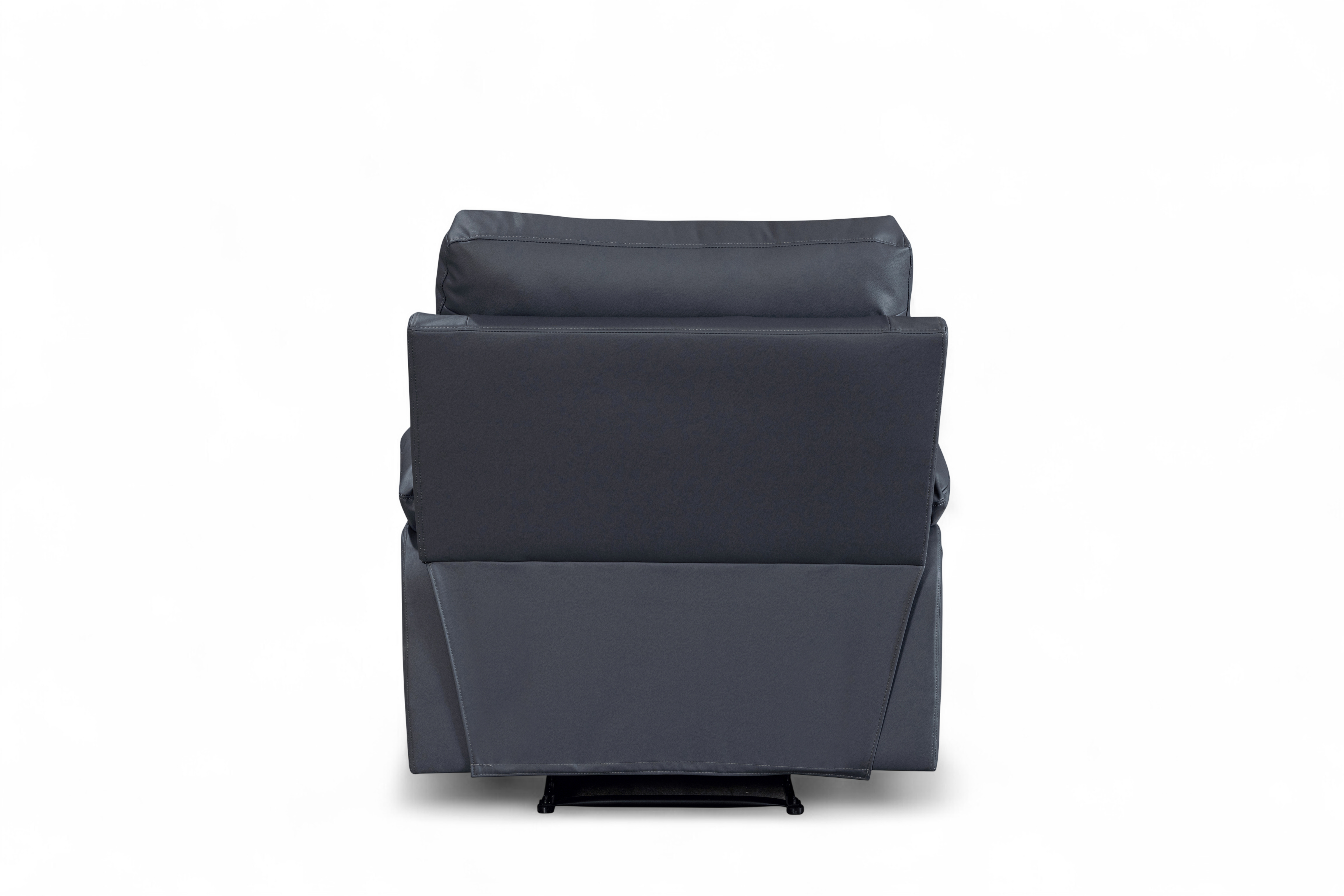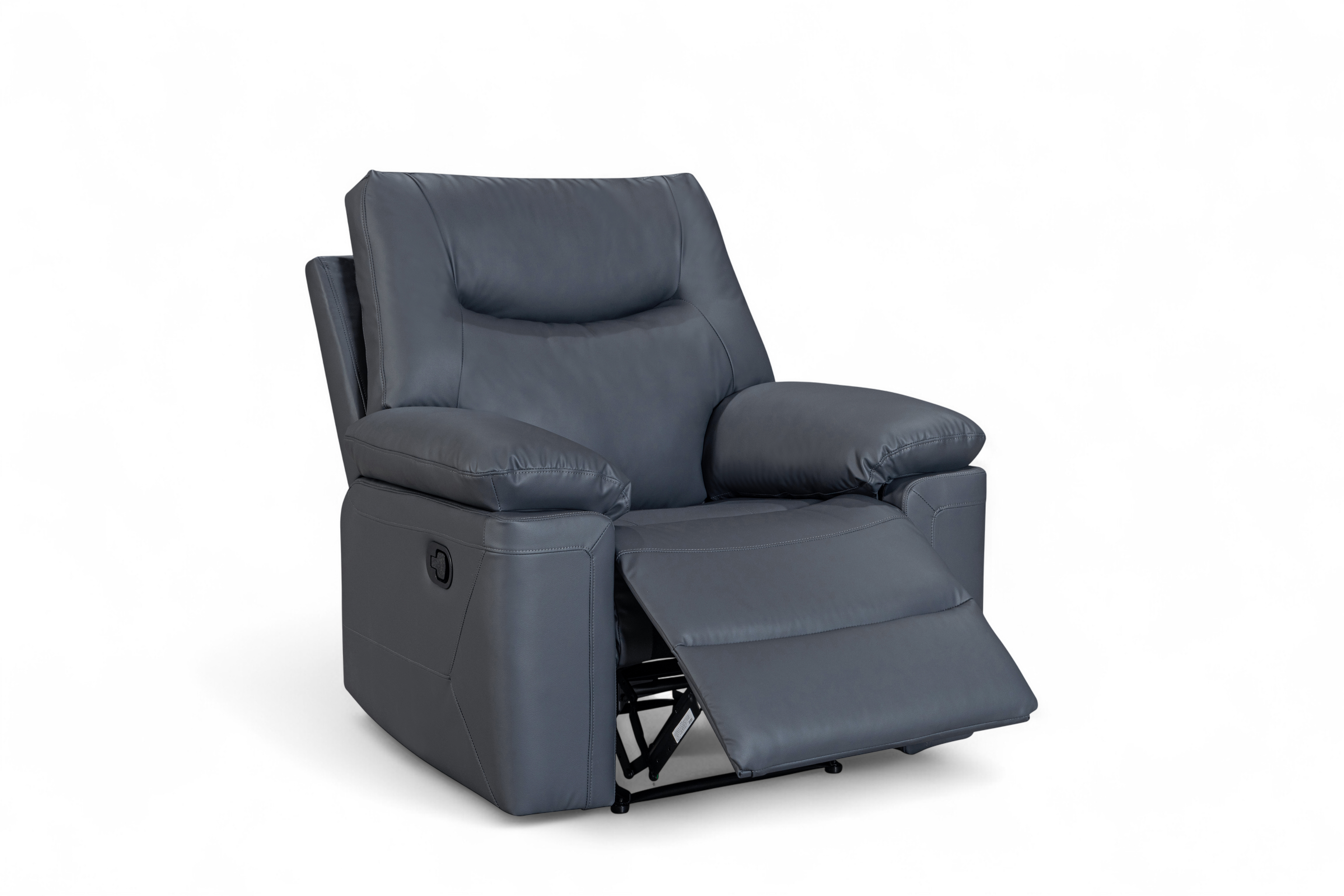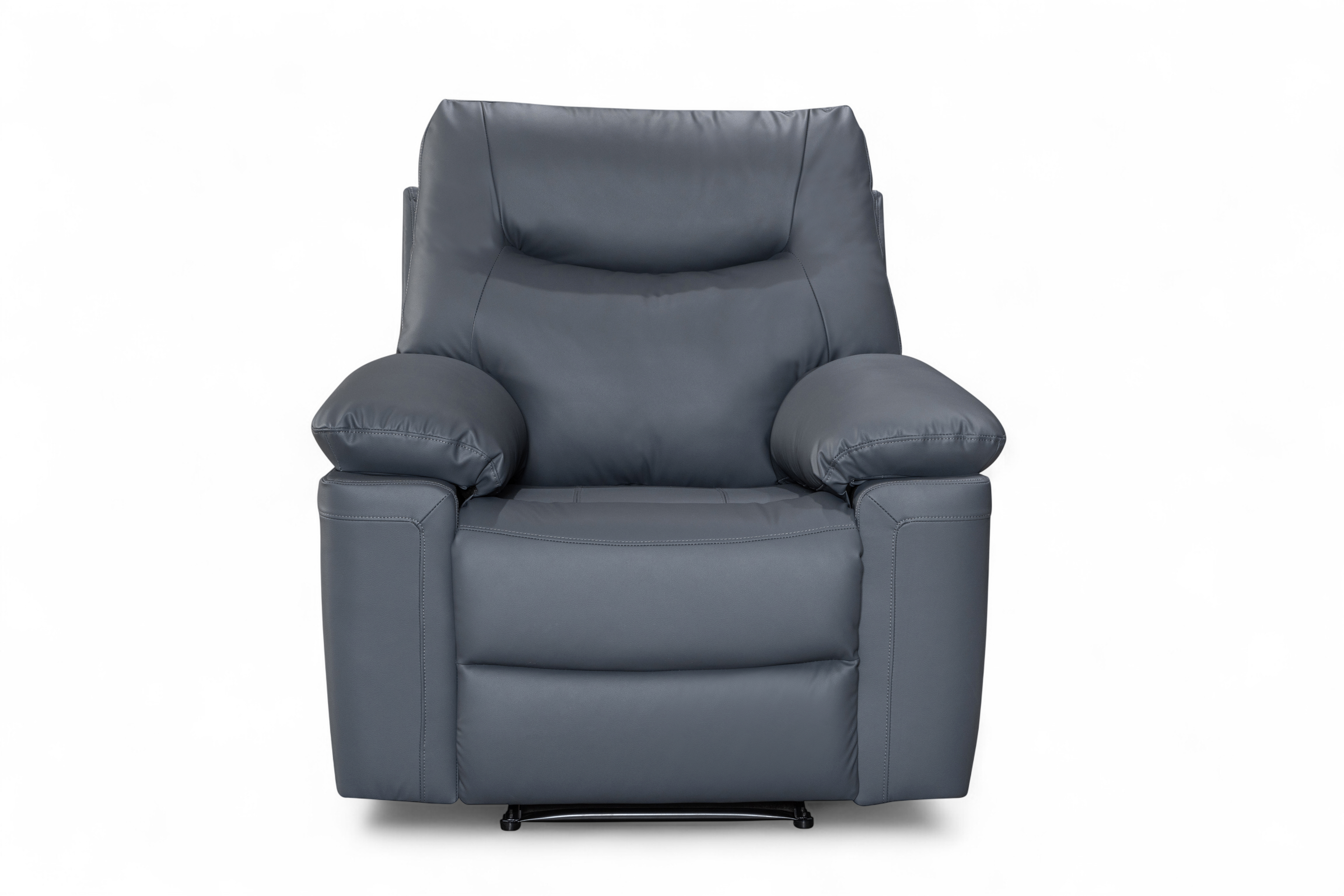 The Columbia Recliner Chair is upholstered in dark grey faux leather with a smooth, matte finish. The design is clean and modern, with gently curved lines and subtle stitching detail. It features a manual lever-operated recline function, allowing you to lean back and put your feet up to unwind. The padding is generously filled for everyday comfort, with soft armrests and plush back cushions designed to support. A practical choice for smaller rooms or paired with other pieces from this range.