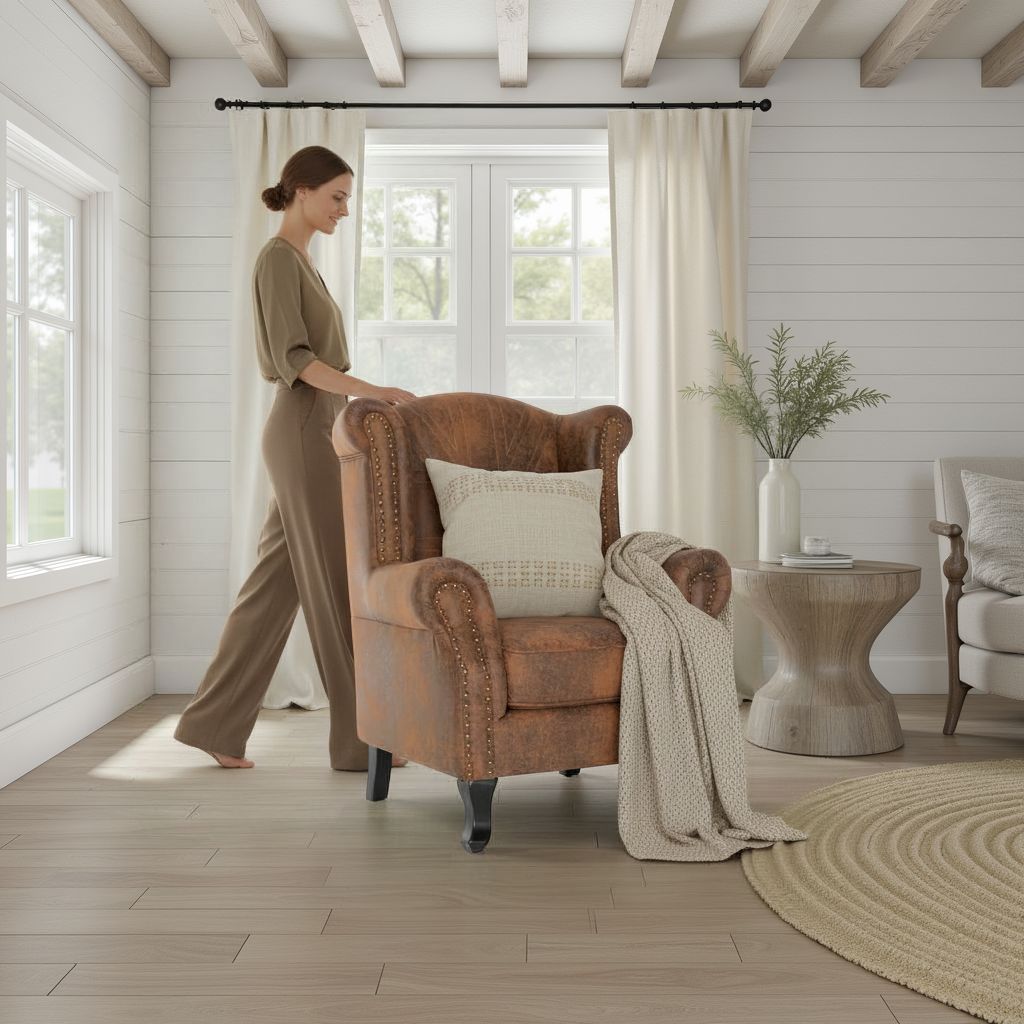 Designed with comfort in mind, the chair features a comfortable padded backrest, perfect for relaxing in after a long day. The wooden feet provide stability and elegance, while the traditional fireside wingback armchair look exudes charm and sophistication.