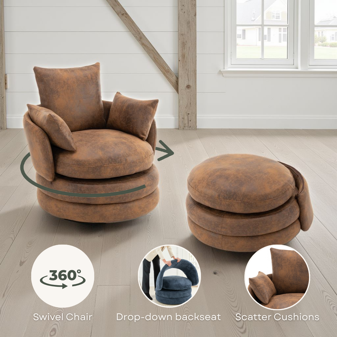 The Faux Leather Suede Brown Teri Accent Swivel Chair is an excellent choice to add stylish seating to your home. The swivel functionality makes this tub chair not only a perfect accent piece, but also a versatile seating option. The durable faux leather upholstery comes in suede brown finish, ensuring this accent chair stands out in any environment. Two bolster cushions and one scatter cushion are included with the chair in matching upholstery. Both the seating cushion and the smaller cushions can be freely removed, and the backrest can be pulled down to completely change the silhouette of the Teri Accent Swivel Chair, making it easy to store it in smaller spaces should the need arise, or to use as a footstool. The seating cushions is filled with medium density foam.