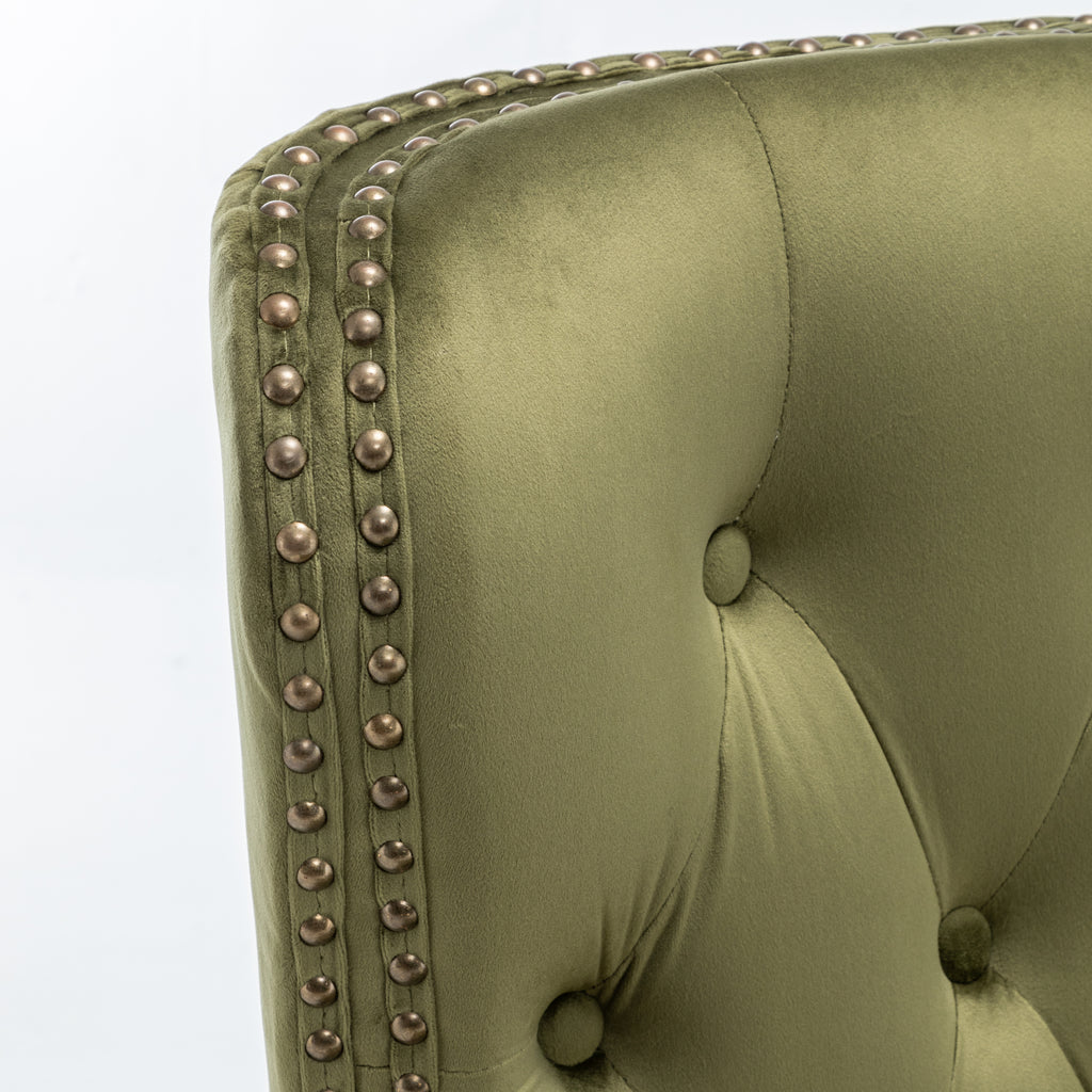 The Velvet Sage Green Buttoned Carmona Wingback Recliner Chair combines classic detailing with practical comfort. Upholstered in sage green velvet, it features a tall winged backrest with deep buttoning and brass gold-coloured stud trim along the arms and wings. The silhouette includes gently scrolled arms, a cushioned seat, and wooden legs in a black finish, giving the chair a traditional and bold look. The backrest, seat, and armrests are padded with medium-density foam, offering a supportive feel whether seated upright or reclined.