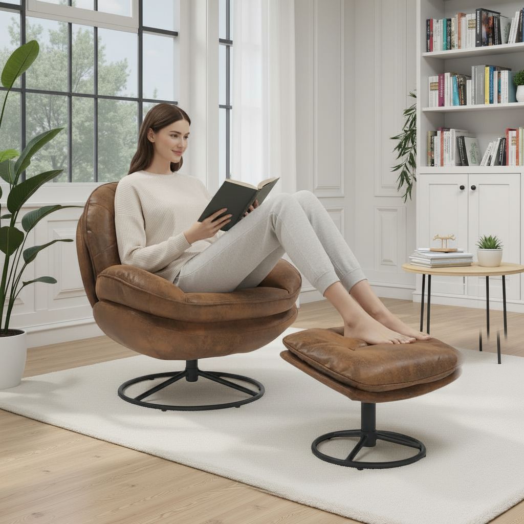 Faux Leather Suede Brown Azura Swivel Accent Chair with Footstool