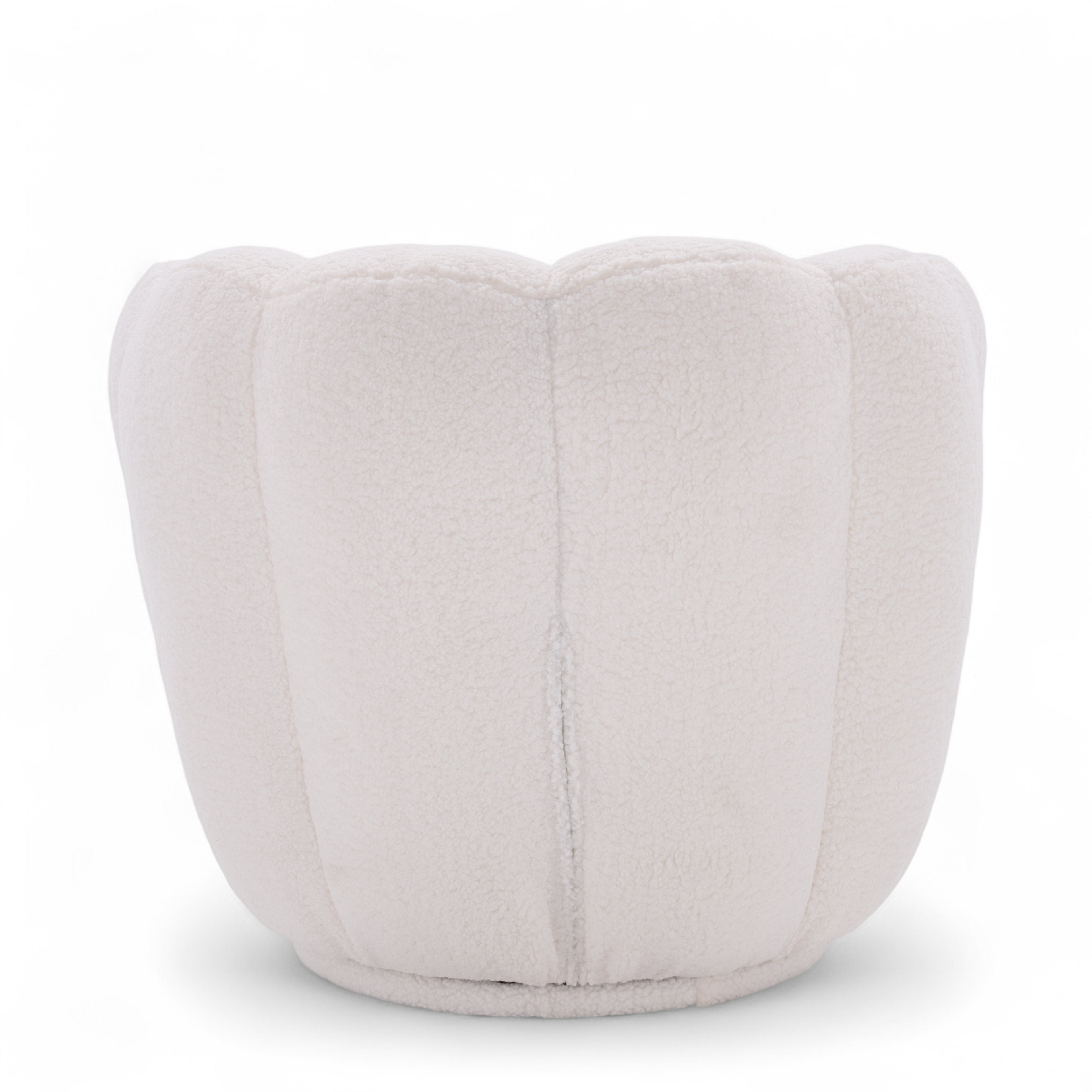 The Teddy Boucle Fabric White Naomi Scalloped Barrel Chair features a rounded silhouette designed for relaxed, comfortable seating. Its barrel-style form curves around the seat and back, offering a supportive feel. The overall shape is reminiscent of a classic tub chair with a softer, more sculptural profile created by the scalloped detailing.