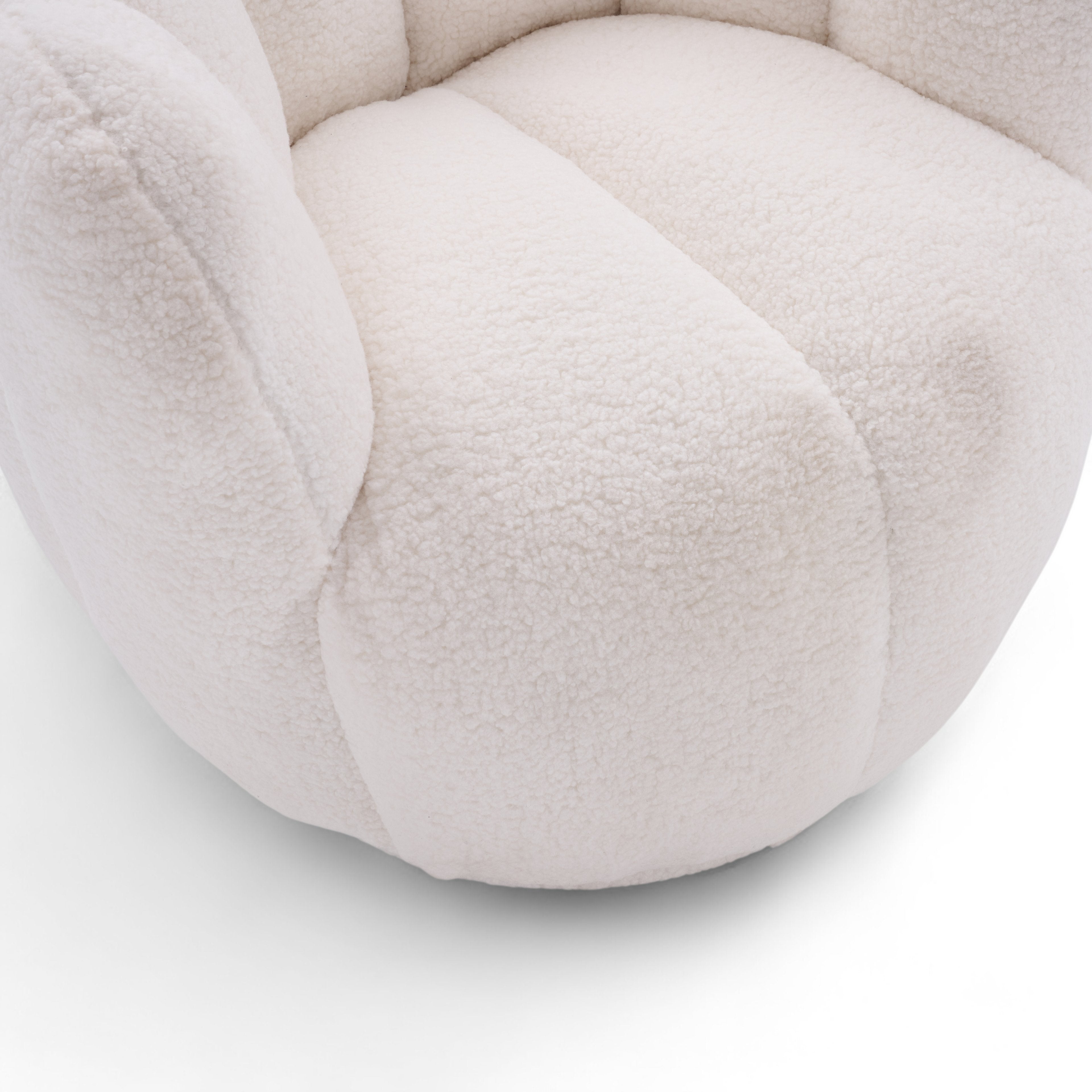 The scalloped panels wrap neatly around the chair, adding subtle structure and visual depth. The curly teddy boucle upholstery gives the chair a cosy, textured look. The striking white finish keeps the chair light and modern, helping it stand out while still working well in neutral interiors.