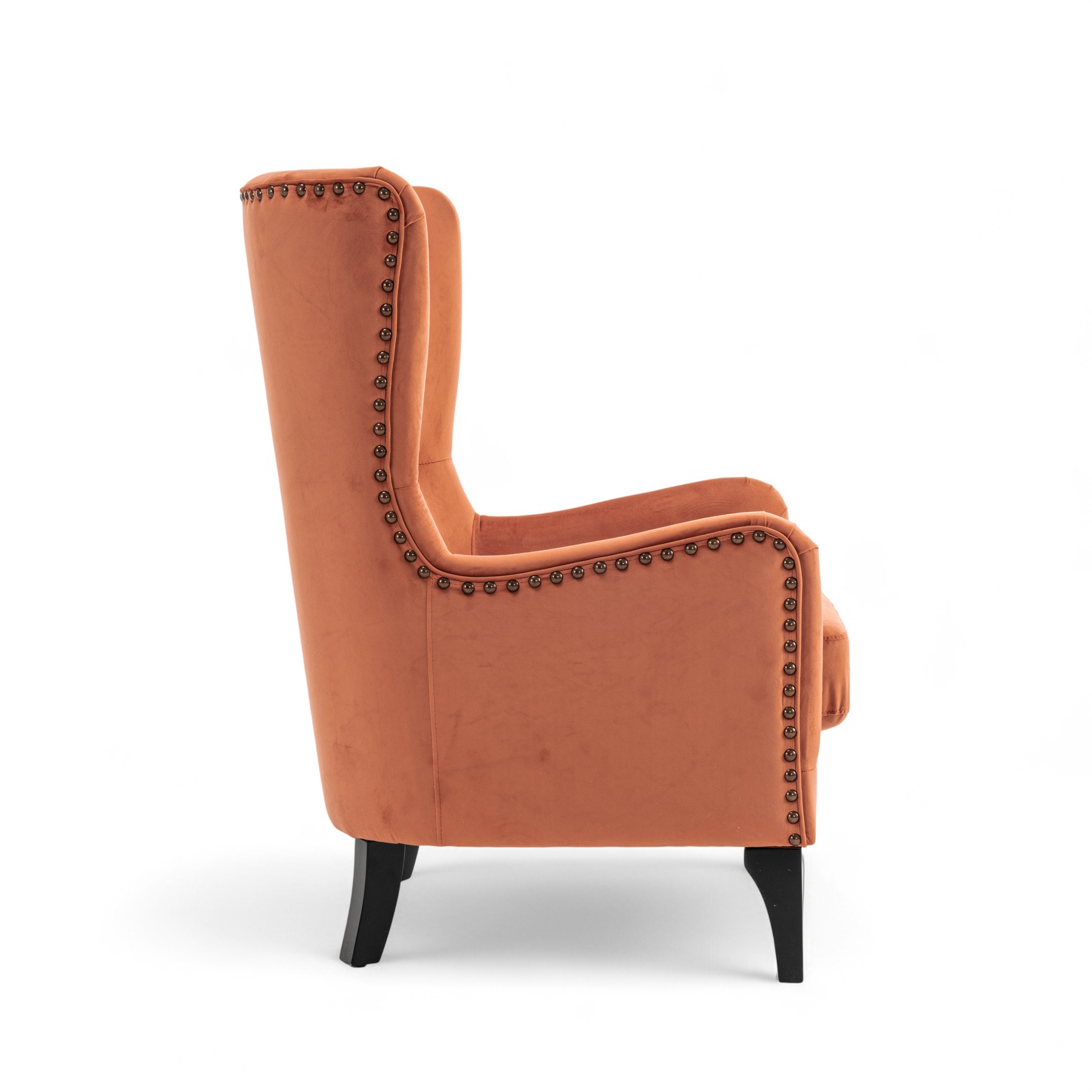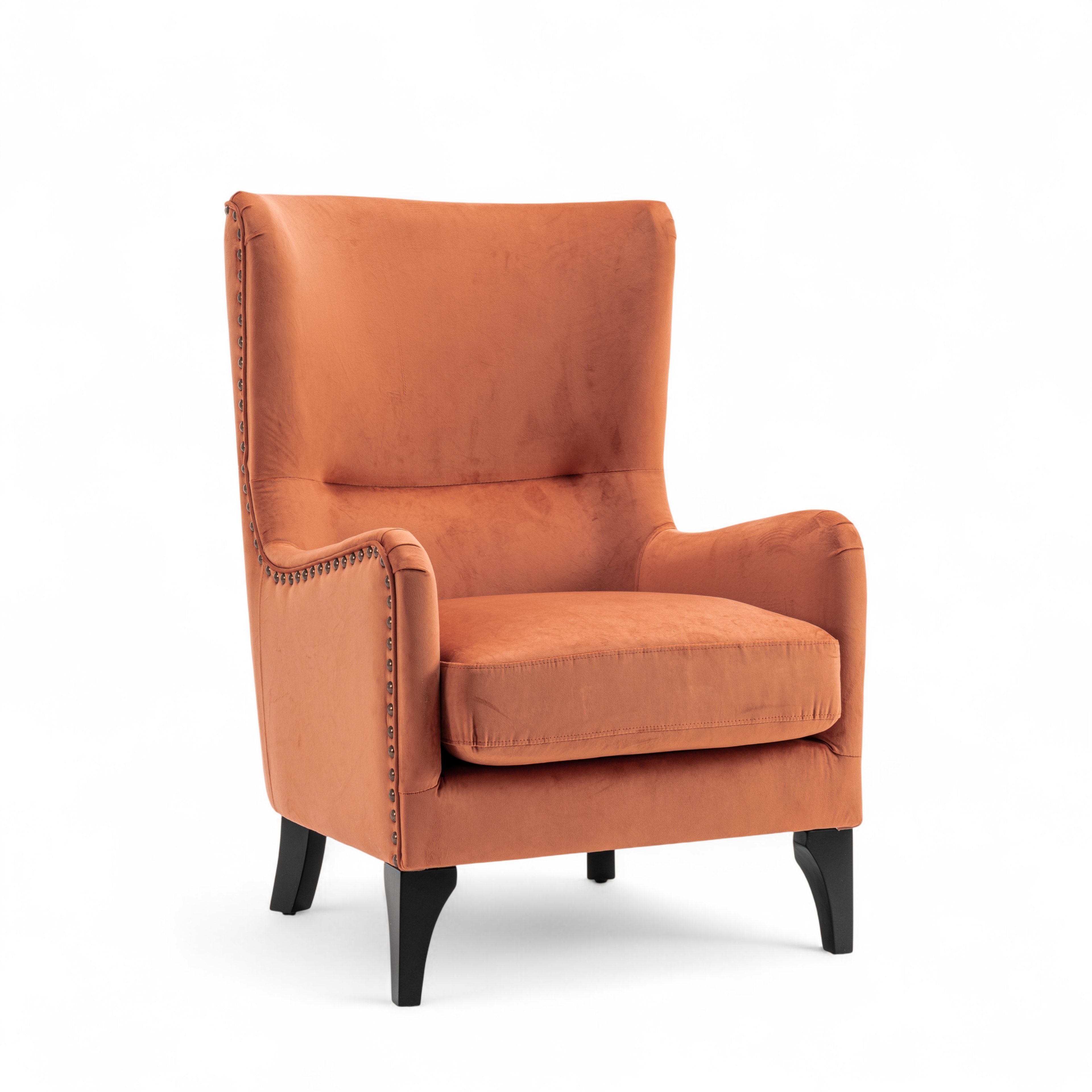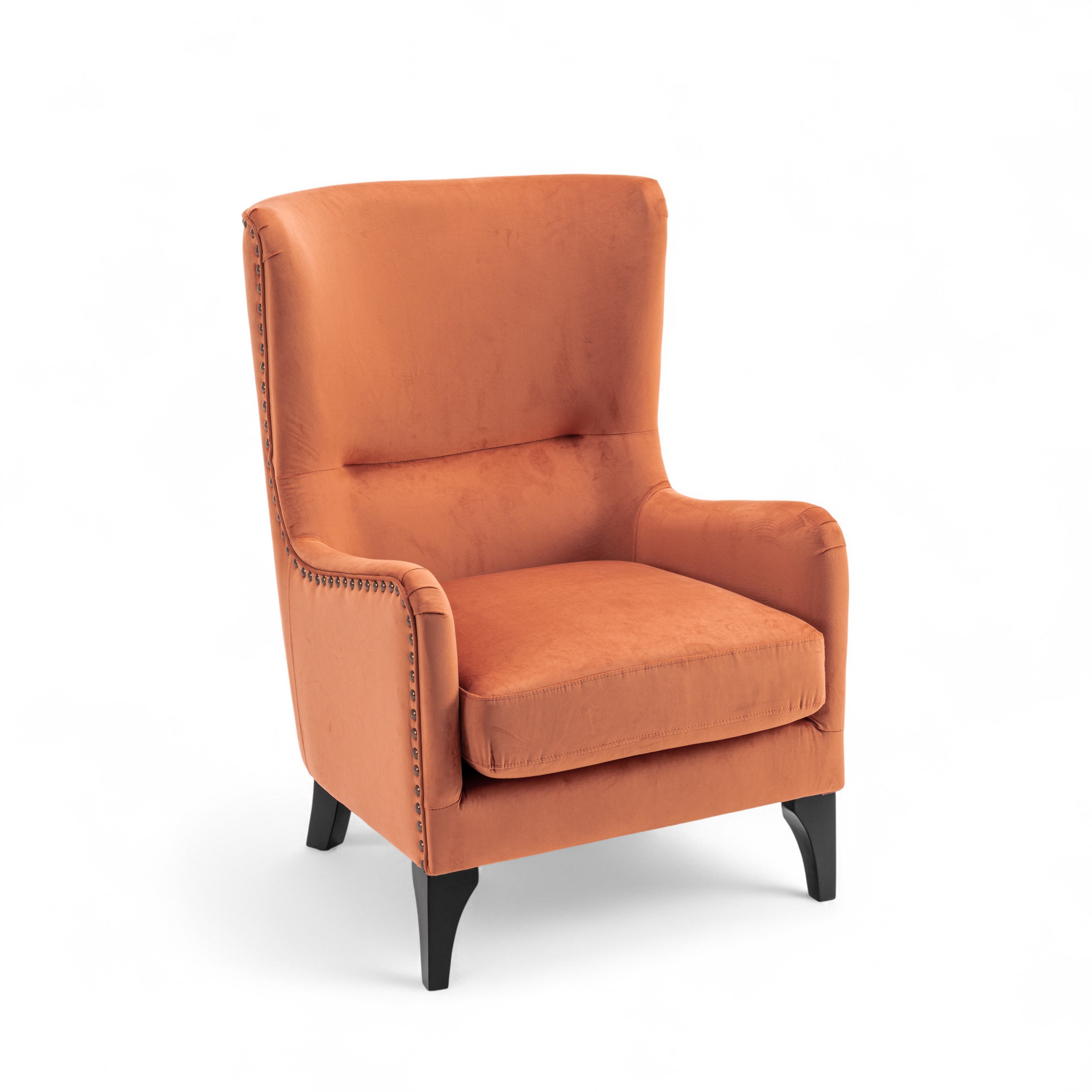 The Segovia Accent Chair is a stylish and elegant addition to any home. Wrapped in elegant velvet in orange, it offers a beautiful look. The wingback silhouette is additionally accentuated by decorative studs lining the backrest and armrests, making this accent chair a perfect choice for those looking to add an elegant piece to their living room, bedroom, conservatory, or any other room in need of sprucing up.