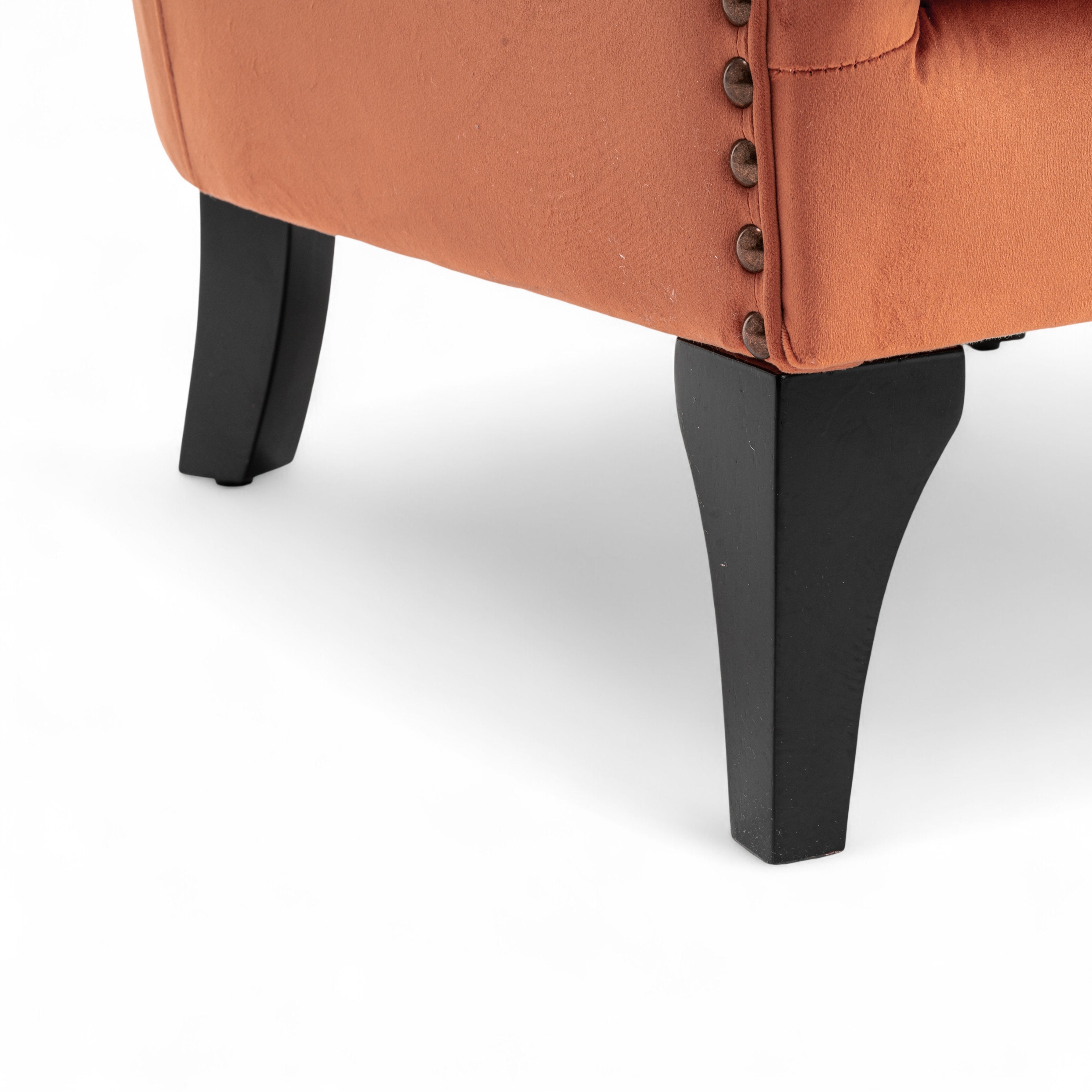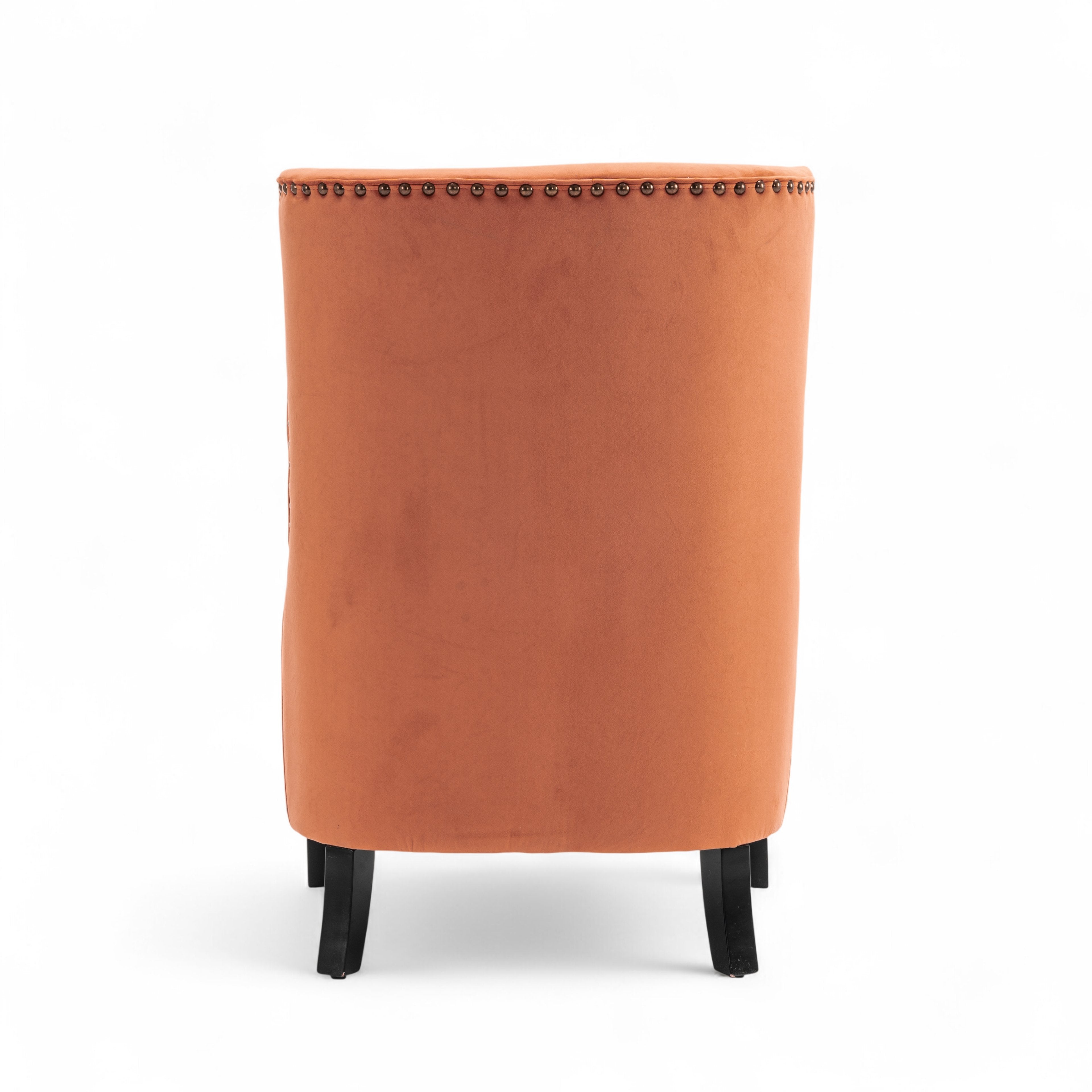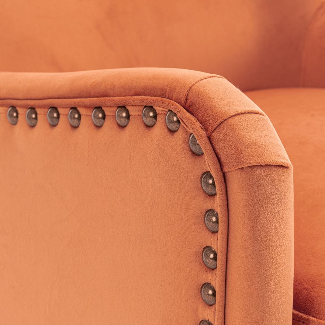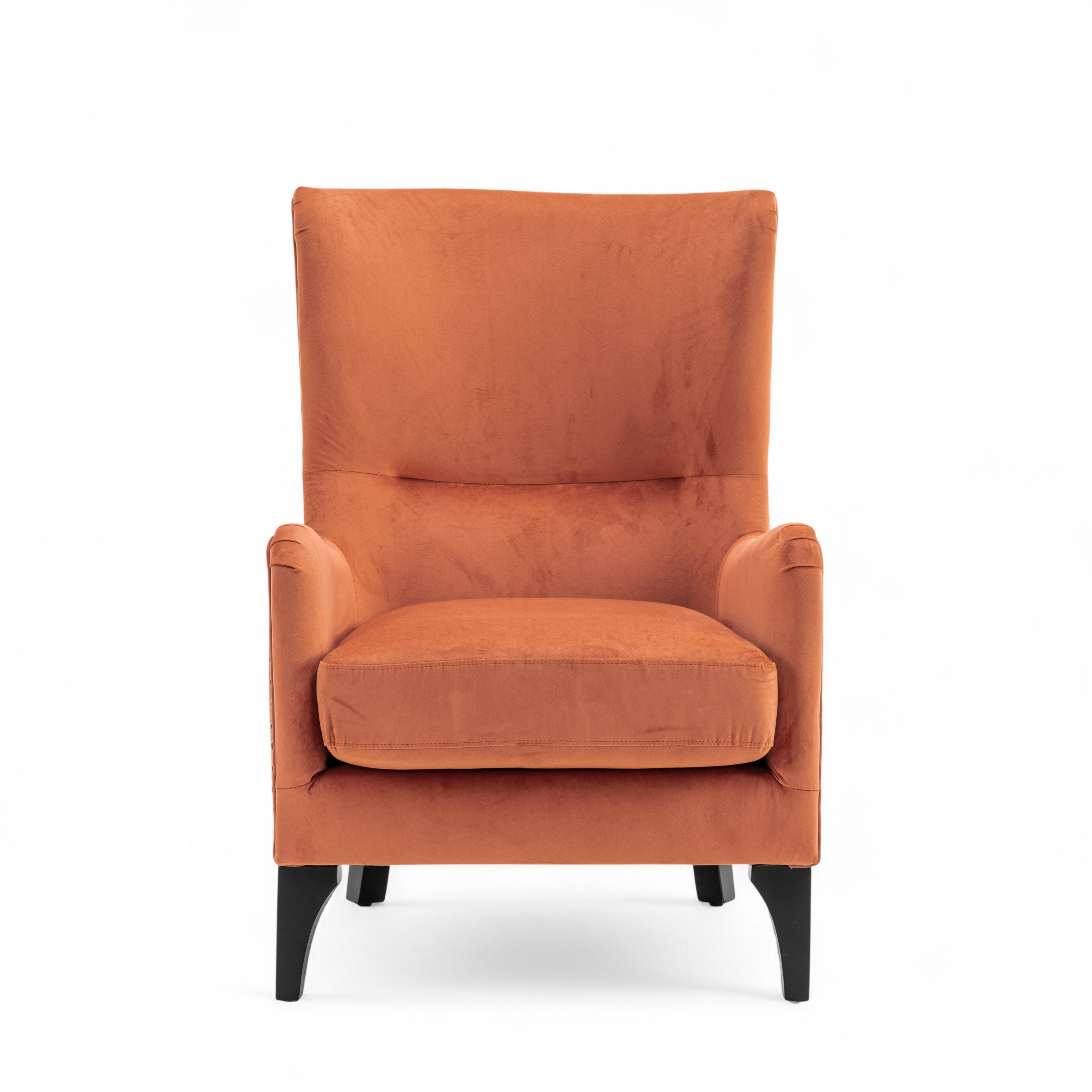 The Segovia Accent Chair is a stylish and elegant addition to any home. Wrapped in elegant velvet in orange, it offers a beautiful look. The wingback silhouette is additionally accentuated by decorative studs lining the backrest and armrests, making this accent chair a perfect choice for those looking to add an elegant piece to their living room, bedroom, conservatory, or any other room in need of sprucing up.